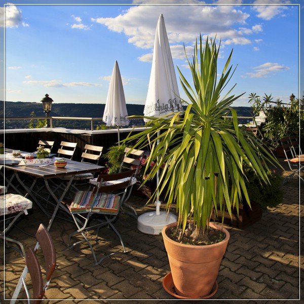 Auf unserer Sonnenterrasse werden die Stunden des Tages leicht und fließen am Abend in das Blau der Stadtsilhouette. Dann verwandelt sich unsere Sonnenterrasse in eine Sternenterrasse. Kosten Sie von unseren Kaffee-und Kuchenspezialitäten und verwöhnen Sie Ihren Gaumen mit einem Glas Wein aus unserem reichhaltigen Angebot: Wählen Sie zwischen regionalen und internationalen Weinen.